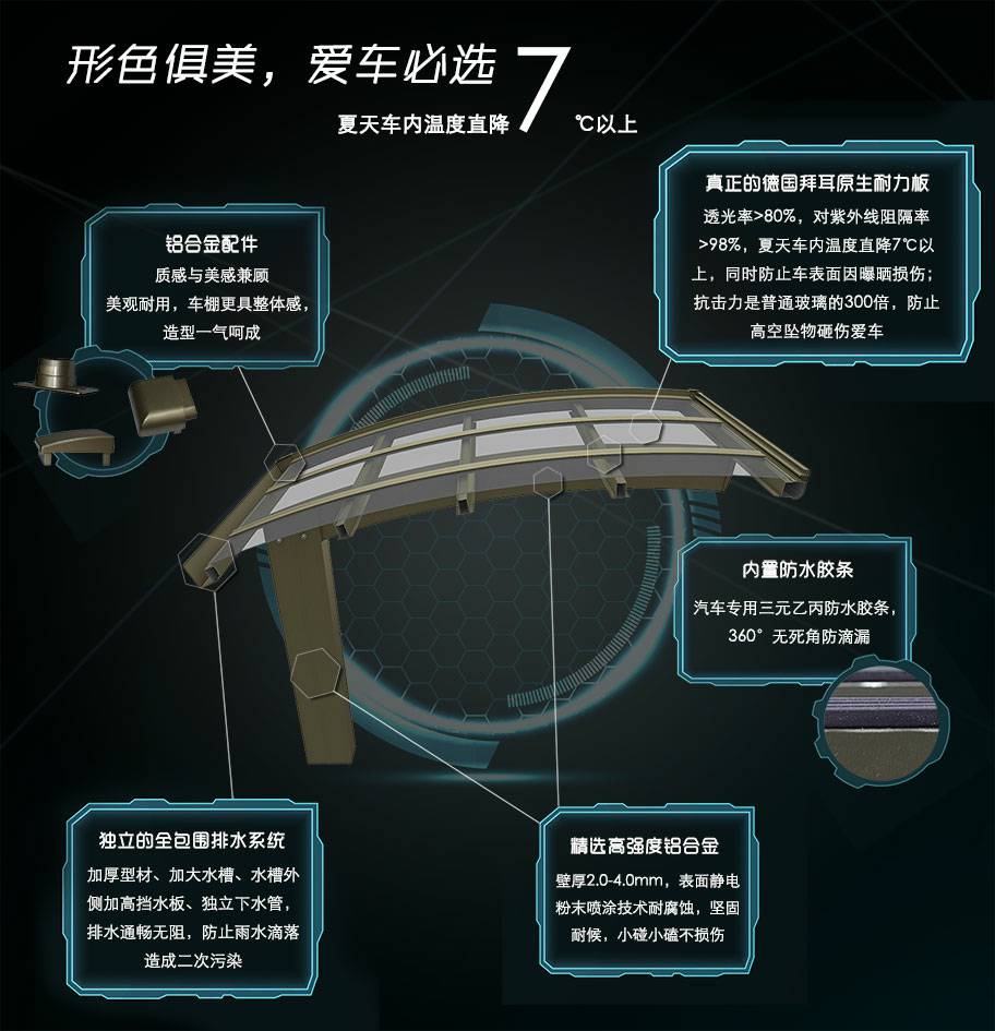 耐力板:真正的德国拜耳原生料耐力板,阻隔紫外线,抗击力是普通玻璃的300倍;