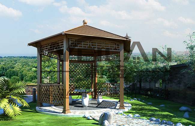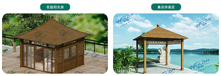 厦门维安绿色农业发展有限公司凉亭系列产品是采用高强度铝合金为原材料,经酸洗铬化,电泳或静电喷涂,木纹转印处理后,精密定制设计,保障安装。它具有防水防潮,不膨胀不变形,防腐蚀,具有逼真的木质感。成为别墅住宅及市政园林等建筑美丽的风景。